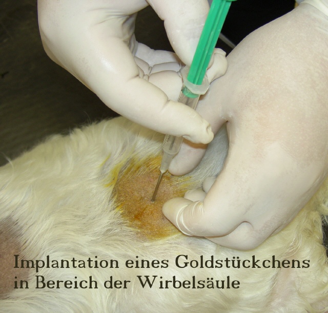 Nach einer sorgfältigen Diagnose mit Hilfe u.a. der Gangbildanalyse, Schmerz- und Triggerpunktpalpation (= manuelle Untersuchung auf Schmerzsituationen) und Röntgen, werden dem Hund in Narkose um jede Hüftpfanne an mehreren Stellen mehrere Golddrahtimplantate an Akupunkturpunkten eingesetzt. Der Eingriff dauert je nach Schwere der Erkrankung in der Regel zwischen 45 Minuten und zwei Stunden: