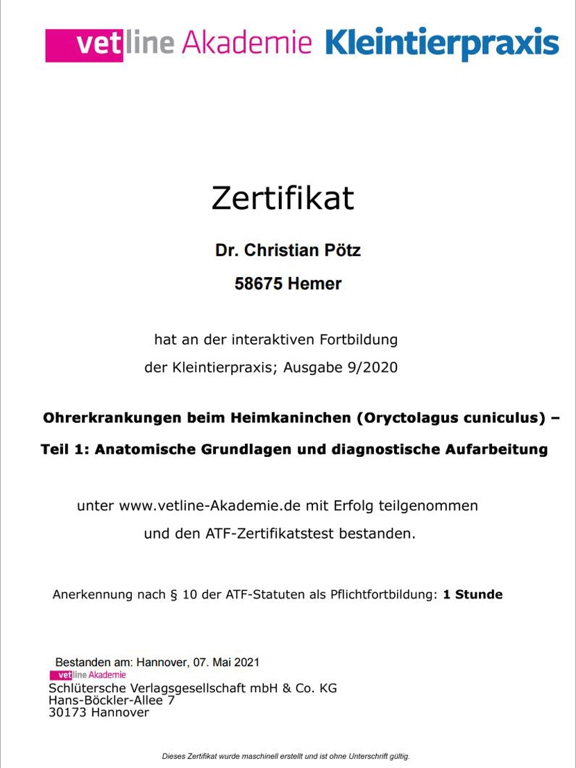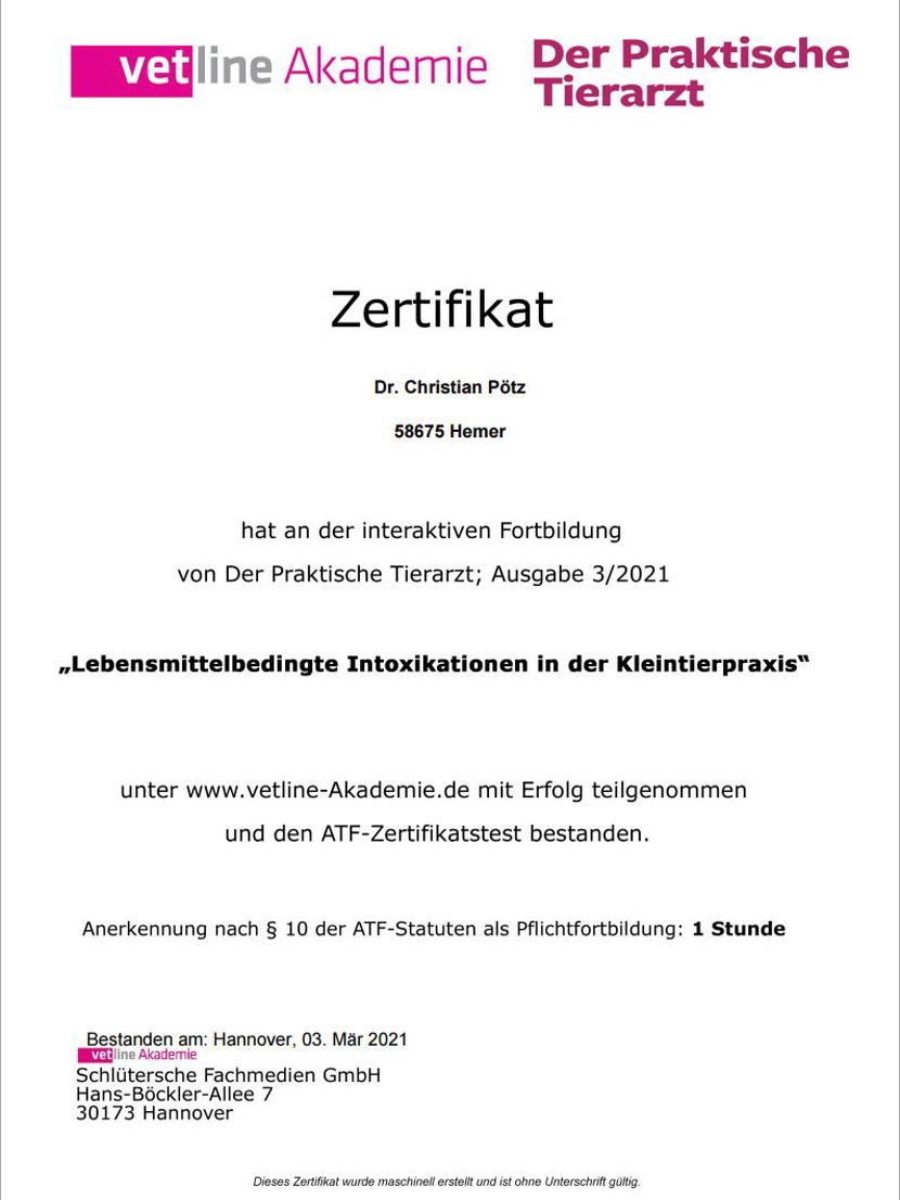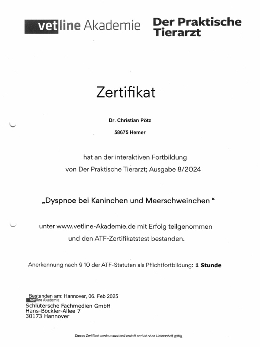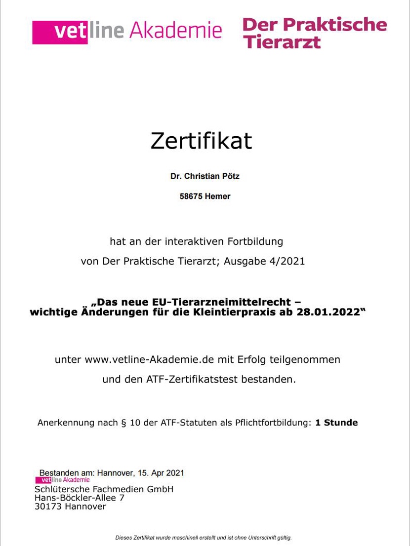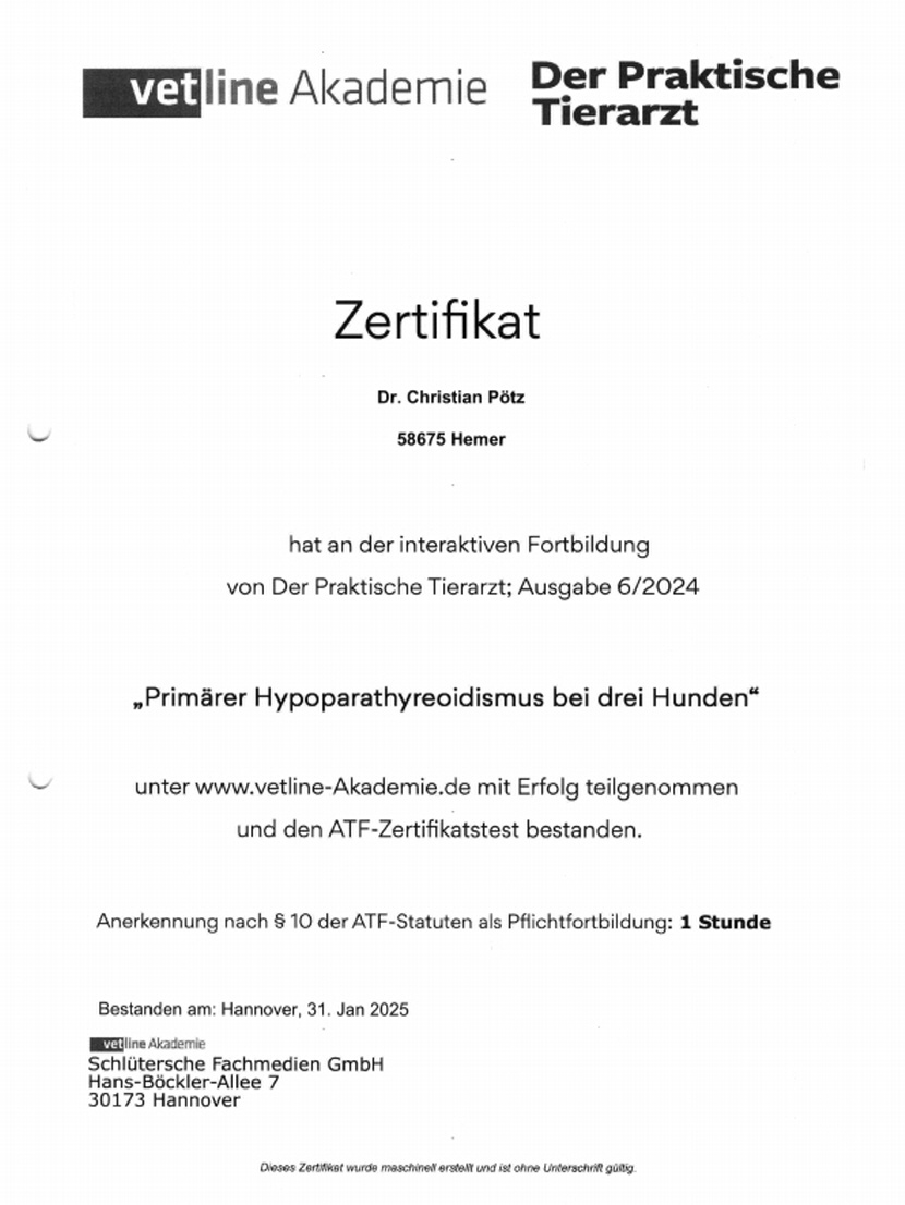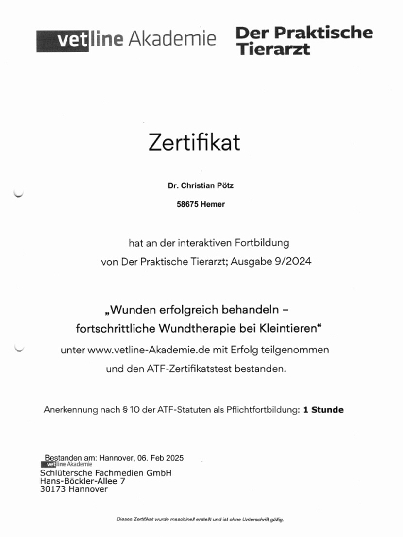 Unser aller Anspruch an Qualität und Qualifikation zeigt sich in meiner Zulassung als Fachtierarzt für Kleintiere mit Zusatzbezeichnung.