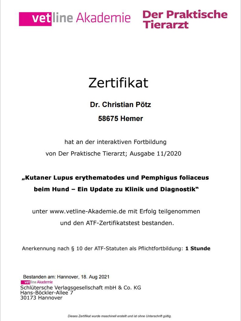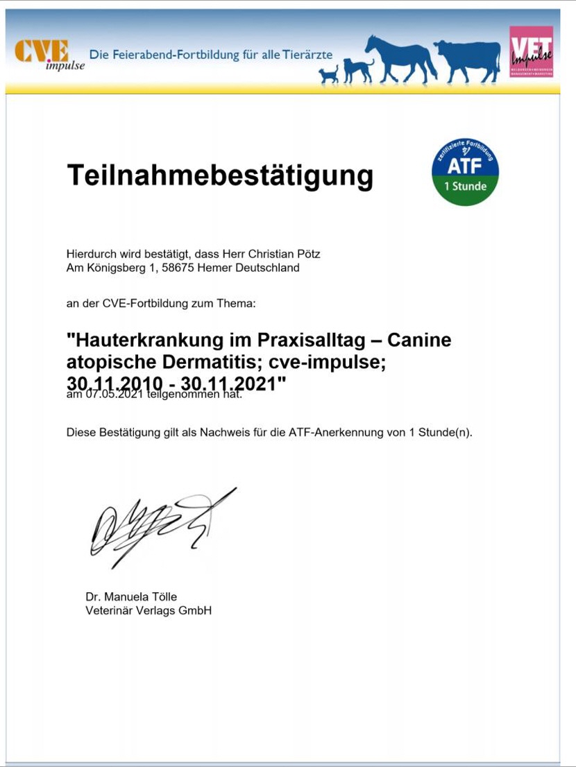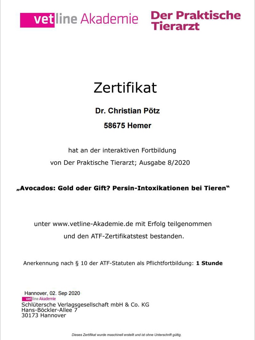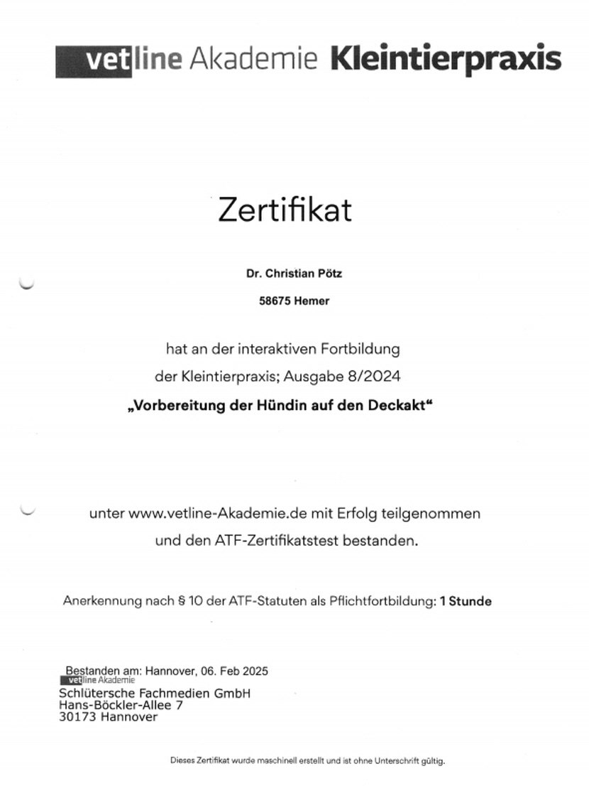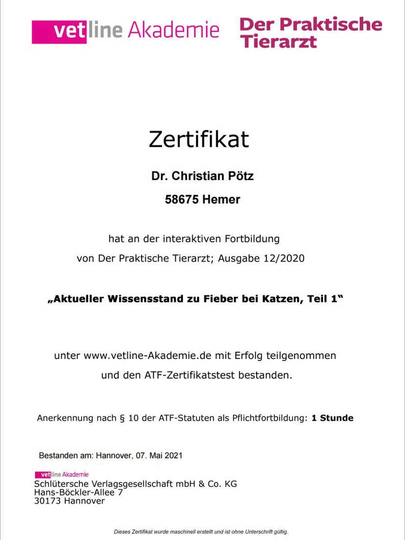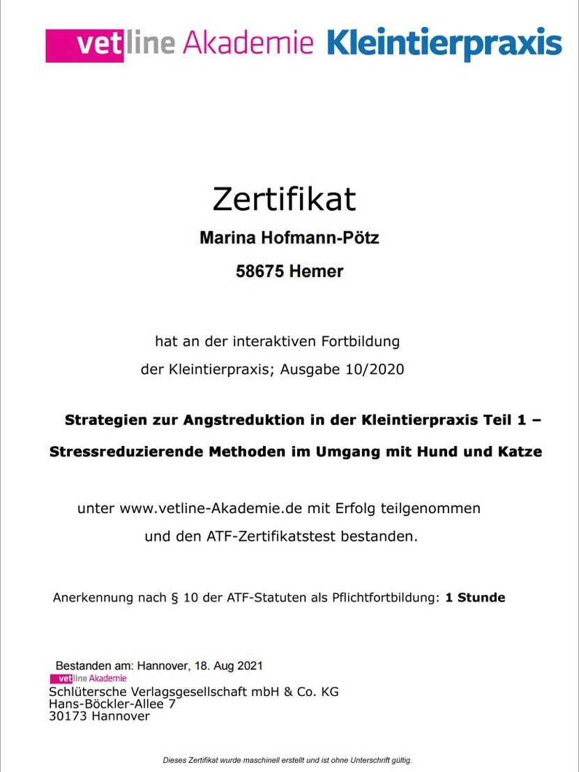 Unser aller Anspruch an Qualität und Qualifikation zeigt sich in meiner Zulassung als Fachtierarzt für Kleintiere mit Zusatzbezeichnung.